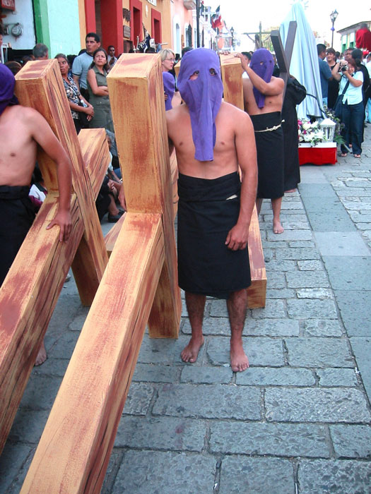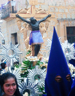 On Easter Friday there are traditional reenactments of the crucifixion in many villages, churches and neighborhoods. There are several well organized villages near the city but if you happen to be at any particular village, you'll be surprised at how authentically and proudly everyone carries out their own role. Each year different families rotate the responsibility and privilege of hosting a station of the cross so that as the processions arrive, snacks, music and drinks are offered to rest a bit and then continue. That same afternoon in the city an amazing procession of Silence is organized and proceeds through the main streets of town. This is an impressive procession with floats that are decorated by most city church congregations and enhanced with images of the crucified Christ and the Virgin Mary.